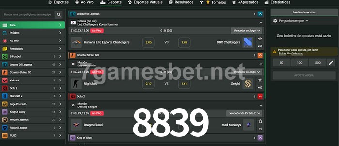 O 8839 oferece uma grande seleção de opções de apostas em e-sports com probabilidades competitivas